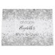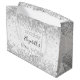 En presentpåse för en feminil och glamourös bröllopsfest. En stilren vit bakgrund dekorerad med falskt silverkonfetti, glitter. Personliggör och lägg till ett datum, namn. Namnet skrivs med en modern handskriven stilspråk.