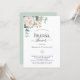 En chic vit bakgrund. Dekorerad med en vit blomma, blomma (peony) och gröna akvarellmålade eukalyptusblad, kvistar, grönska och en falsk guld kvist. Personifiera och lägg till namnet på bruden och festdetaljer. Svarta bokstäver. Baksida: grön bakgrundsfärg.