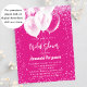 En het rosa bakgrund. Dekorerad med rosa konfetti och vita ballonger. Vit text. Anpassa och lägg till ett namn och festdetaljer.