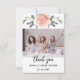 Ett tackkort för bröllopsfest. Vit bakgrund, dekorerad med roséguldsrosor, lila blommor och grönska. Personifiera och lägg till ditt foto och tackmeddelande.