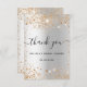 Ett tackkort för en bröllopsfest. En falsk silvermetallisk bakgrund. Med falskt guldglitterdamm. På framsidan stor handskriven script och texten: Tack, din text, titel och datum.