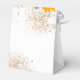 En vit bakgrund dekorerad med solrosor, eukalyptusgrönska och gyllene blad och falskt guldglitterdamm. Med texten: Bröllopsfest och Tack. Personifiera och brudens namn