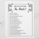 Vill du inte skriva ut dina egna bröllopsduschspel? Använd dessa flygblad med redigerbara frågor. Beställ antal efter behov; Bröllopsduschspel "Hur väl känner du bruden?" med redigerbara frågor. Jag föreslår att du skriver dina frågor i en textredigerare som Anteckningar eller Word och kopierar och klistrar in dem i denna textruta. Dubbelavstånd mellan frågorna och använd versaler för detta "utseende". Du kan också ändra flygbladets färg så att den passar din bröllopsdusch med hjälp av bakgrundsfärgerna och pipetten. En version med fasta frågor finns också här: