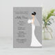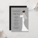 Bjud in gästerna till bröllopsfesten med stil med denna moderna och eleganta bröllopsfestinbjudan. Har en siluett av en brud i en vacker brudklänning med slöja och brudbukett. Denna svarta, vita och silverdesign är ett elegant sätt att bjuda in gäster till din fest. MATCHANDE KUVERT finns tillgängliga för köp nedan