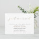 Bröllopsmeddelandet för nygifta dubbelar som en bröllopsfestinladan. Dubbelsidig festinladan har "Just Married" i falskt guld folie tryck med text som tillkännager det nygifta parets äktenskap och inbjuder gäster till en avslappnad bröllopsfest. Anpassa med ditt horisontella foto på baksidan.