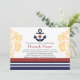 Bröllopsinbjudningar med nautiskt ankare i marinblått och rött med ett ankare som hålls fast av ett hjärta på ett rep och stjärndesign. En gul damaskusgräns håller denna inbjudan snygg och feminin medan stripiga och tryckt stickad banddesign gör den perfekt för en strand- eller havstematiserad bröllopsfest. Artwork © Chrissy H. Studios, LLC. Alla rättigheter förbehållna.