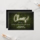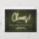 En bröllopsinbjudan med vit neontext "Skål!" på en boxwoodbakgrund med vit text och trim.