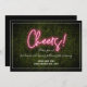 En bröllopsmottagningsinbjudan med neontexten "Skål!" över en boxwoodbakgrund med vit text och trim.