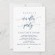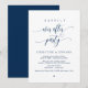 Vacker modern marinblå kalligrafi, Bröllopsflykt-meddelande, Inbjudningskort (Lycklig För Evigt-fest). Detta är perfekt för din bröllopsmottagning och efterbröllopsfirande. Lägg till dina detaljer i matchande typsnitt / bokstäver.