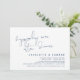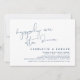 Detta är bröllopsflyktens festinbjudningskort, med minimalistisk marinblå skriptdesign (Lycklig För Evigt Middagsinbjudan).