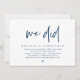 Modern marinblå script-tema, bröllopsinbjudningskort (vi gjorde det). Det är perfekt för din bröllopsfest / efterbröllopsfest. Lägg till dina detaljer i matchande teckensnitt / bokstäver.