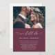 Elegant burgunder och vit ändra datum bröllopsförsening anmälan. Denna enkla anmälan är ett chic sätt att låta inbjudna gäster veta att datumet för ert bröllop har ändrats på grund av oförutsedda omständigheter, och innehåller det nya bröllopsdatumet. Denna trendiga anmälan har vacker "vi gifter oss ändå" vit kalligrafi skrift på en burgunder marsala bakgrund med parets foto, och en vit baksida på kortet.