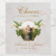 Denna eleganta blommiga bröllopsdesign har ett utbytbart foto av älskande som kysser i en oregelbunden guldbildram med callaliljor och ormbunkar till vänster och höger, ovanpå två sexkantiga guldfärgade överlägg. Ovanför ramen finns meddelandet "Cheers to Love & Happiness", med ordet Cheers skrivet med en elegant handstil, resten med versaler. Under ramen är namnen skrivna med samma eleganta kalligrafiska stil, datumet med versaler. All text är gyllene. Bakgrunden är vit marmor.