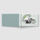 Bröllopsgästbok med fotomall. Vacker blekblå-grön färg med vattenfärgseukalyptus grenar som ramar in fotot. Texten “Gästbok” är i tunn, tryckt teckensnittsstil. Perfekt för naturinspirerade bröllop. Färgerna är gråblå blad och gröna grenar. Tunna linjer ramar in fotot. Baksidan av boken är en mörkare blå.