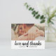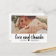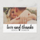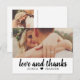 Detta fräscha och moderna tackkort har en fet "kärlek och tack" penselskrift på en ren vit panel, tillsammans med ert bröllopsfoto ovanför för en ljus och grafisk look. De anpassningsbara namnen visas under skriften och håller designen personlig och varm. Ett charmigt alternativ för par som älskar ren design med en avslappnad och hjärtlig touch.