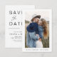 Bröllopskort med datum att spara som har ett foto på framsidan. Kortet innehåller en modern handskriven kursiv typsnitts typografi som är elegant, enkel och modern att använda efter din minimalistiska enkla bröllopsdag firande.
