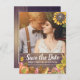 Spara Datum Bröllopsinbjudan Foto Postkortsmallar - Eleganta Höstlönnlöv, Pumpor och Solrosor Akvarell Blommor på Rustik Träbakgrund.