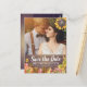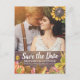 Spara Datum Bröllopsinbjudan Foto Postkortsmallar - Eleganta Höstlönnlöv, Pumpor och Solrosor Akvarell Blommor på Rustik Träbakgrund.