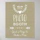 Bröllopsfotobås skylt affisch i rustik burlap mönster med vintage lagerkrans och pil med illustration med hjärtan och handskrivna text och monogram.