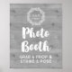 Bröllopsfotobåsskylt affisch i rustikt grått trämönster med vintage krans illustration och handskriven text och monogram.