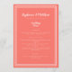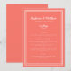 Enkel, minimalistisk och elegant bröllopsmeny med en modern design med en dubbel ram skarp vit kant på en LIVANDE KORALL-bakgrund. Traditionell formulering ger tidlös men modern förfining. Anpassa bröllopsdesignen med dina menydetaljer i vit text och skrivstil. Baksidan av kortet matchar i enfärgad korall.