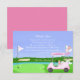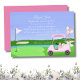 Den här golfinspirerade tackkortet för bröllopsfesten är designat med den blivande bruden i centrum. Det har en hjärtformad puttinggreen och en flaggpinne som fladdrar i vinden, prydd med orden "Blivande brud". Golfbilen är festligt dekorerad med champagne, presenter, en tiara och en intrikat illustrerad bröllopstårt. En brudslöja faller elegant från golfbagen och tillför en charmig touch. Designad av Daphsam, kommer detta unika tackkort med en lättanvänd mall för att säkerställa en stressfri planering.