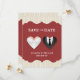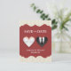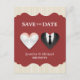 Tillkännage ditt bröllop på ett originellt och informellt sätt med detta roliga Save the Date-kort som presenterar hjärtformade brud- och brudgumsparet på krämfärgad och röd bakgrund.