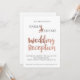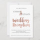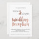 Inbjudan till elegant bröllop om typografi i ro guld. Bröllopsdagens kvällsmottagning med denna moderna, enkla elegant- och chic faux-penselhandsskrift från ro guld på en vit anpassade-bakgrund. Perfekt för enkelt, elegant och modernt bröllop
