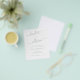 Den romantiska minimalistiska designen har vacker och elegant typografi på vit bakgrund med ett rent och enkelt utseende. Spara papper genom att inkludera detaljerna på baksidan av bröllopsinbjudan istället för på ett separat informationskort. Inkludera även RSVP-information om dina gäster svarar elektroniskt (valfritt).