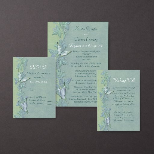 Den här vackra inbjudan till trädgårdstemat innehåller mjuka pasteller i vattenblått och mynt-grönt, med vackra vindruvor och fjärilar. Alla textområden är redo för dig att anpassa dig. Motivet för mjuk blommigt har en söt som matchar märkrn på andra sidan med redot för ditt Bride and Groom namn och bröllop. Andra matchande produkter i min butik.