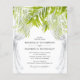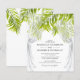 Bröllopsinbjudningar för budget tropisk strandtema med en stilren vit bakgrund som kan ändras till valfri färg, genomskinlig bröllopsdrake, palmlöv, kedjeljus och en elegant bröllopsmall som är lätt att anpassa.