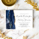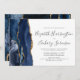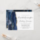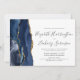 Den moderna bröllopsinbjudan från elegantens lämnat kant har en marin blå vattenfärgsagat gräns som trimmas med faux guld glitter. Anpassadet kombinerar handskrift, tryckplåt och kursivt typsnitt i grått i kol mot vit bakgrund. Den omvända sidan har en matchande marin blå och guld-agate-design.