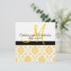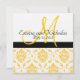 Vackra Gulter och Vita Damaskonsbjudanden med monogram på framsidan och bröllopsinbjudan på baksidan. Visas med exempelformulering så att gästernas namn kan skrivas för hand på inbjudan. Dessutom kan alla inslag utom dämpare anpassas så att färg kan ändra linjer och fyrkanter och text.Layout för bröllopsinbjudningar av Elke Clarke, 2010. Grafik licensierad. Anpassa med din bröllop-information och färger.