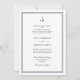 Nautisk marinblått och vitt ankarbröllop med föräldrar till brud och brudgummi namngivna som värdar. Vitt med dubbla, marinblått gräns och ankarillustration överst i mitten, blockerad och manustext i marinblått och marinblått med tunt vitt rand på baksidan. Klassiskt nautiska bröllop.