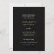 Utformningen visar en klassisk bröllopsinbjudan i vit och gyllene typografi med svart bakgrund. Utformningen är klassisk och elegant och kommer att vara perfekt för bröllop.