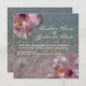 En inbjudan till ett badbröllop med ett bakgrundsfoto av mousserande klart hav vatten. Foton av rosa hibiscus-blommor överst till lämnat och höger i grund. Anpassa den vita texten med detaljer om händelsen. Baksidan har oceanens bakgrund i vatten.