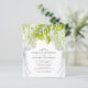 Bröllopsinbjudningar med tema tropisk strand på budget med en stilren vit bakgrund som kan ändras till valfri färg, genomskinlig bröllopsdrake, palmlöv, strängljus och en elegant bröllopsmall som är lätt att anpassa.
