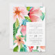 Den här söt, färgstarka, tropiska bröllopsinbjudan har en underbar blommigt. Vattenfärgblommor, inklusive hibiscus och plumeria, är ordnade i en tropisk blommigt buquet som också har lush emerald grönt foliage och turkosa blue coral. Kortets baksida har en baksida färg för att komplettera den rosan och korallens blommigtar på kortets framsida. Matchande bröllop-kontorsmaterial finns i vår samling av Tropical Blommigt bröllop.
