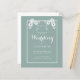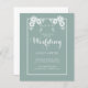 Slatblå bröllopsinbjudan med vit text och blommigt utmed tunna gräns. Färg och text är helt redigerbar online med några klick, men om du behöver hjälp kontaktar du designer på ArtByLiz@gmx.com så anpassas kortet till dig utan kostnad för extra.