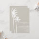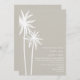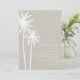 En bröllopsinbjudning med en illustration av två vita handflatan träd vid högerna. Anpassa texten med information om tillfälle.