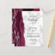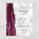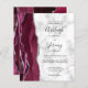 Den vänstra kanten på denna eleganta moderna bröllopsinbjudan har en burgunderfärgad akvarell-agatkant med silverfärgad falsk glitter. Den anpassningsbara texten kombinerar handskrift, kopparplåt och kursiv stil i svart på en grå och vit marmorerad bakgrund. Baksidan har en matchande burgunder och silver agat-design.