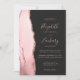 Den vänstra kanten på denna eleganta moderna bröllopsinbjudan har en rosafärgad akvarellagat-kant med falskt roséguldglitter. Den anpassningsbara texten kombinerar rosaröd handstil, kopparstick och kursiv stil på en mörk, nästan svart bakgrund. Baksidan har en matchande burgunderröd och roséguld-agat-design.