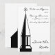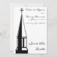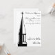 En bröllopsinbjudan med en svart-vit grafisk illustration av en kyrktorn och kors. Baksidan visar en förenklad kyrka.