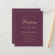 En enkel, minimalistisk bröllopsinbjudan i budgetklass. Den har endast gulgyllen text på vinröd (nära burgunder) bakgrund. Orden Bröllop och namnen är skrivna med en elegant kalligrafisk skrift.