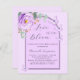 En violett, lavendelbakgrund med lila valv. Dekorerad med violetta, lavendel och lila blommor, rosor, grön akvarell eukalyptusgrönska och fjärilar. Anpassa och lägg till namnet på den blivande bruden och festdetaljer. Text: Kärlek i blom.