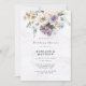 Designen har ett tryckt färgat element med blad i nyanser av lila och purpur över gröna eukalyptusblad och blå krämfärgade peonblommor. Perfekt för din bröllopsfirande!