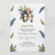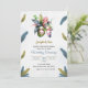 Bröllopsinbjudan med tropiska blommor och färgglada fjäderaccenter på en strukturerad bakgrund. Detaljer i elegant skript och fet stil.