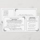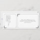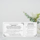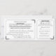 Denna tryckta bröllopsinbjudan i stil med en vintage-biljett i klassiskt svart och vitt innehåller också ett avtagbart svarsbrev för RSVP. Enkla rundade ramar med hörn är accentuerade med utsmyckade, vintage dekorativa bladvoluter. Brudens och brudgummens namn tillsammans med rubriken för RSVP är också markerade med dekorativt rullverk. På baksidan kan returadressen läggas till på RSVP och ytterligare detaljer om bröllopet på inbjudan. Skär linjen för svars kupongen indikeras på baksidan av inbjudan med en blek streckad linje och en saxbild.