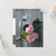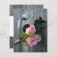 En bröllopsinbjudning med ett foto framför en liten bukett av rosa ros och en grönsak inlindad med knäcktråd. Bouquet vilar i handtaget på en ladugårdsdörr. Anpassa motsatt sida med information om tillfälle.