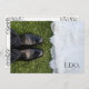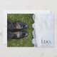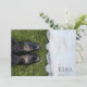 Inbjudan innehåller en fågels syn i öga på en brud och en brudgumm som visar lycklig pars skor och klänning.